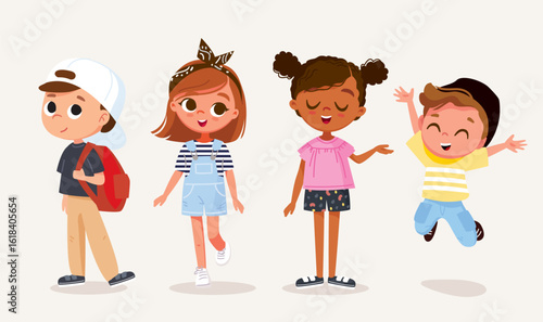 Vector vector art of diverse group of happy children jumping and cheering, transparent background