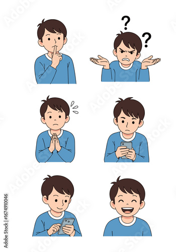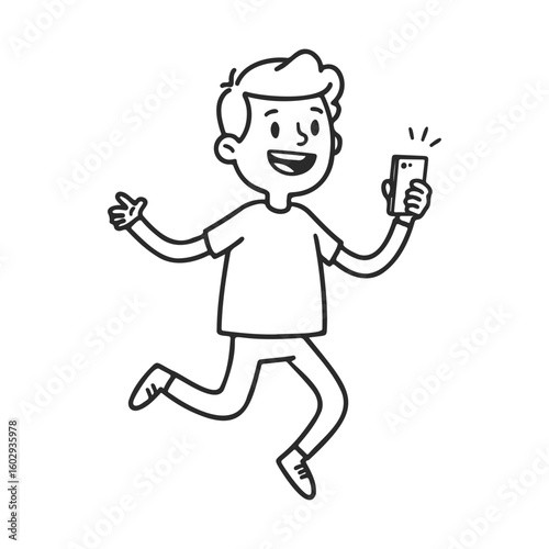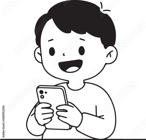 楽しくスマートフォンを使う子供たち シンプルでかわいい線画イラスト