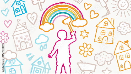 Crayon fun cute kid colorful line art doodle set badge, scribble line flower, background. Hand drawn doodle sketch childish element set. Flower, book, fire, cloud, children draw style design elements