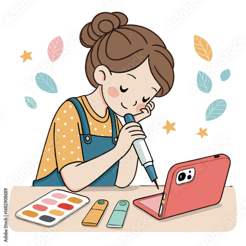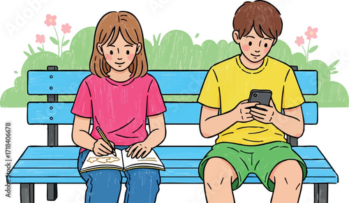 Vector illustration depicts a boy and a girl using a phone and a tablet.