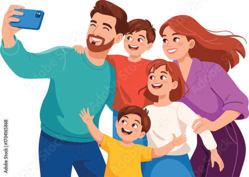 Large family of seven, in a flat design style. Mom, dad, children, grandparents in bright colors. Vector illustration.