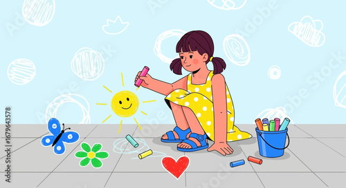 vibrant flower garden with a variety of colorful blooms, including orange, yellow, and blue flowers, in a child like drawing style