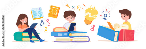 Cute smart children cartoon characters reading books feeling interested and excited scene set