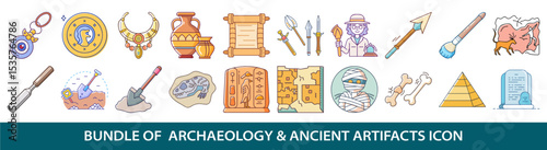 Archaeology icons, fossil excavation, ancient history, paleontologist brush, dinosaur bones, museum artifacts, historical ruins, digging tools, science discovery, line art vector