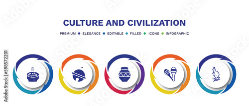 set of culture and civilization filled icons. culture and civilization filled icons with infographic template. flat icons such as crema catalana, sleigh bell, native american pot, maracas couple,