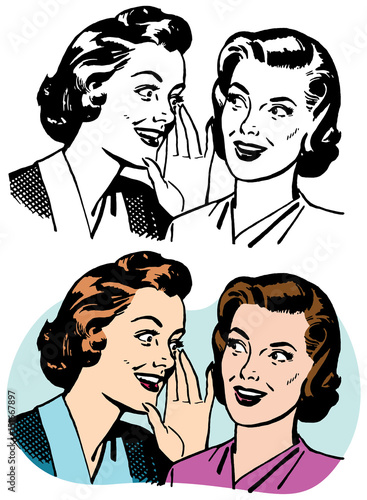 Two women gossiping, whispering in ear. Pop art retro vector illustration.