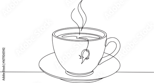 Teapot pouring tea to cup. Continuous line drawing.