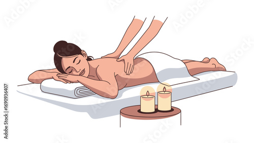うつ伏せに寝てマッサージを受けているマッサージ着姿の可愛い女性 シンプル イラスト ベクター