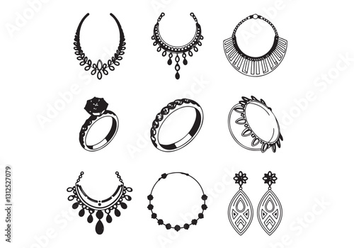 Jewelry Line Art Vector Set Necklaces, Rings, Earrings EPS