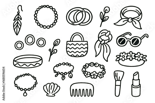 Boho Accessory Icons. Hand-drawn doodle illustration boho style accessories feather earring, beaded necklace, bangles, rings,