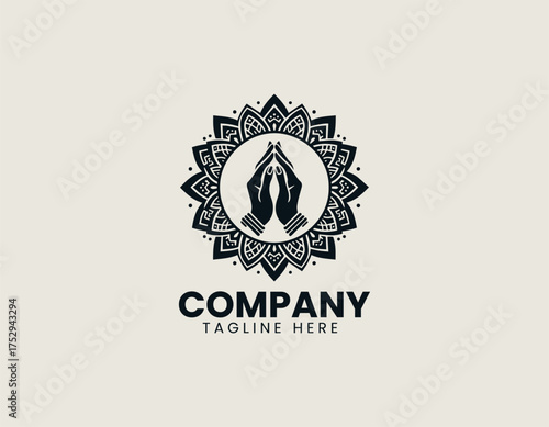 Circular line art vector illustration of traditional Namaste hands gesture surrounded by decorative mandala border. Spiritual design concept