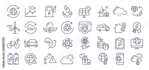 Ecology Lifestyle Line Editable Icons set. Vector illustration in modern thin line style of eco related icons: CO2 neutral, zero waste, use bike, green energy and global warming. isolated on white