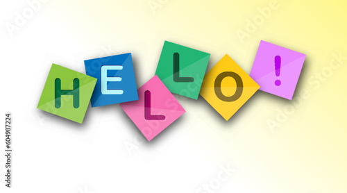 Hello. Welcome speech on multicolored square sheets. Vector banner for a website, app, or presentation