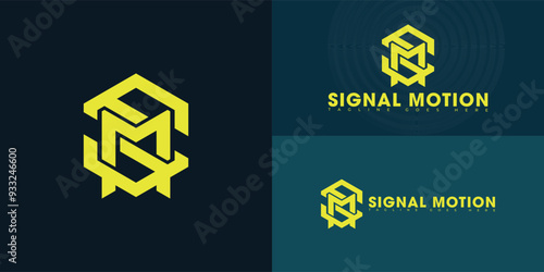 Abstract hexagon initial letter SM or MS in yellow color isolated on multiple background colors. The logo is suitable for commercial film production logo design inspiration templates.