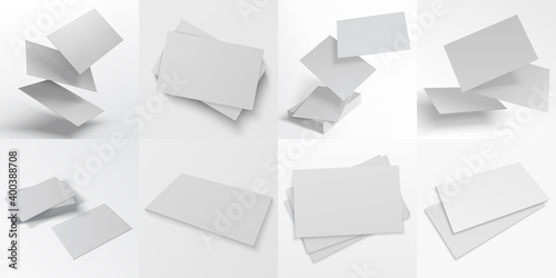 Business card mockup. Realistic blank stacks, sheets of paper and flying pages. Cardboard flyers lie on smooth surface. Visual design elements for presentation with copy space, vector set