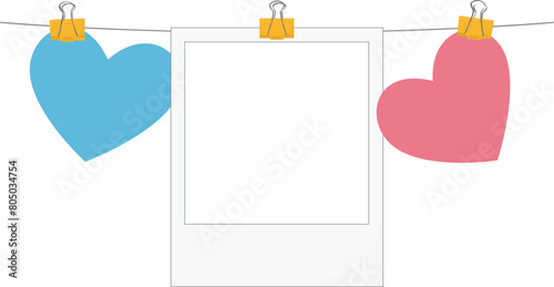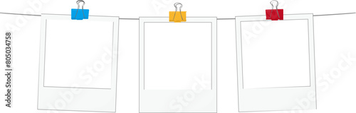 Empty white photo frame with shadows hung on a binder, adhesive tape, paper clip, pin. Set realistic photo card frame mockup - for stock