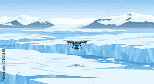 Advanced drone flying over icy landscape for exploration and surveillance.