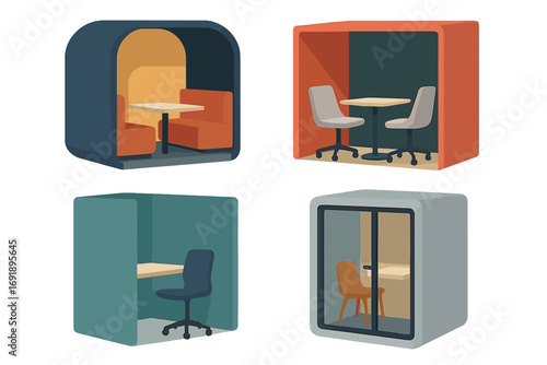 Coworking Space Icons. Solid style icons of coworking spaces: shared desk, office lounge, meeting hub, hot desk icon. Solid style