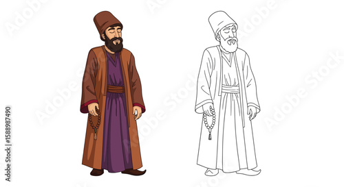 The tradition of whirling dervishes from Mevlana Celaleddin Rumi, who lived in the city of Konya during the Ottoman period, to the present day. Vector illustration.