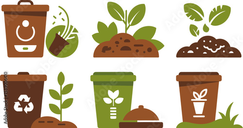 Food waste flat icons set – compost, recycling, eco-friendly symbols