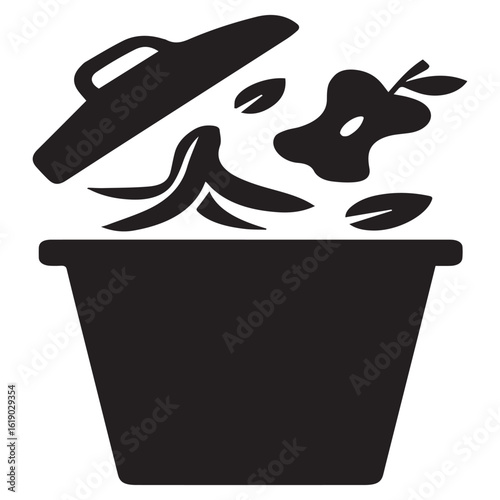 Composting and recycling icons set – solid style waste management, sustainable living, and eco-friendly symbols: bin, compost heap, pitchfork, waste bag, thermometer, compost tumbler, food scraps.
