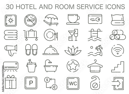 Hotel web icons set. Hotel and vacation - simple thin line icons collection. Containing hotel services, relax, travel, service, room, booking, facilities and more. Simple web icons set
