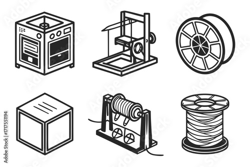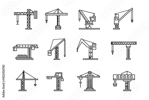 Outline industry icons set: heavy and light production, factory, plant symbols, conceptual infographic pictograms, manufacturing, machinery, industrial process, equipment and more.