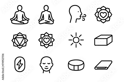 Set of minimalist line icons for yoga and meditation. Includes spiritual symbols like lotus pose, flowers, and incense for wellness concepts.