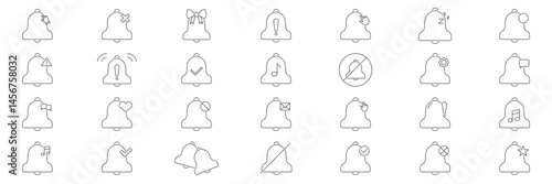 Notification Bell Icon Set. Alert, Reminder, And Notification Symbol Collection. Includes Mute, Settings, Message, And Music Alerts. Editable Stroke. Isolated Vector Illustration