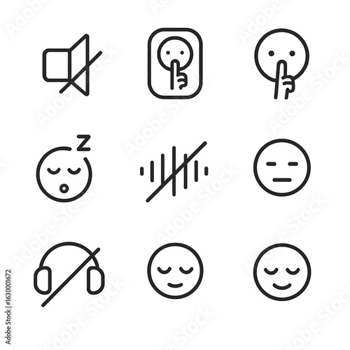 Silent Icons Set. Outline icon set of silence: mute button, quiet zone sign, finger on lips, no sound symbol, sleeping face, sound