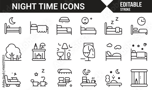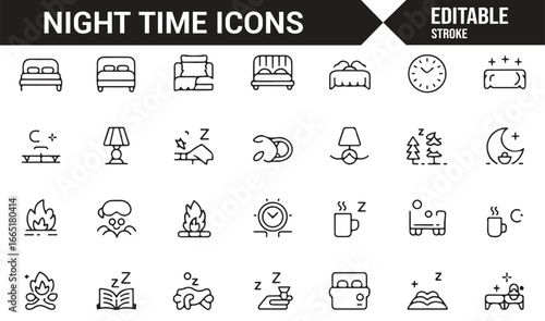 Line vector icons of kids bedtime routines: toothbrush icon, pajama symbol, bedtime story, night lamp, sleep tracker, lullaby sound, bedtime chart, moon phase.