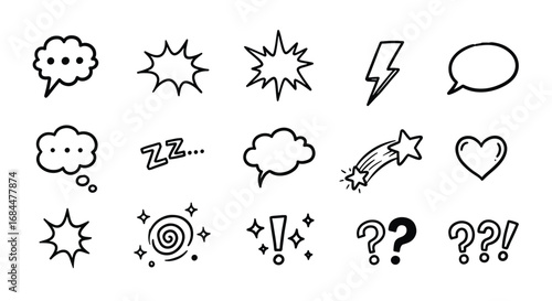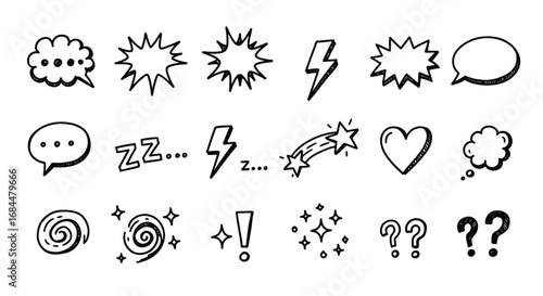 Collection of HandDrawn Comic Book Speech Bubbles and Symbols.