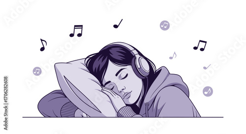 Serene Slumber: Girl Enjoys Calm Dream With Headphones and Musical Notations
