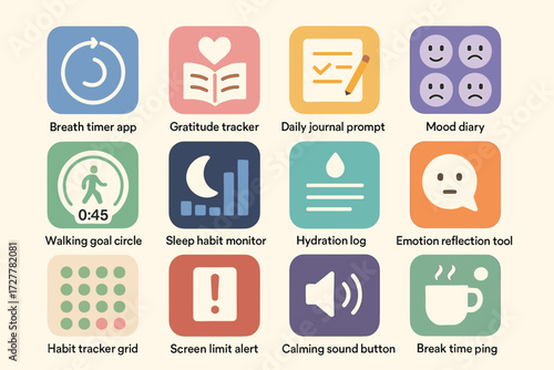 Meditation and sleep app icons with lotus, crescent moon, brain, and sound wave – Ideal for mindfulness branding, night-time routines, or cognitive wellness designs.