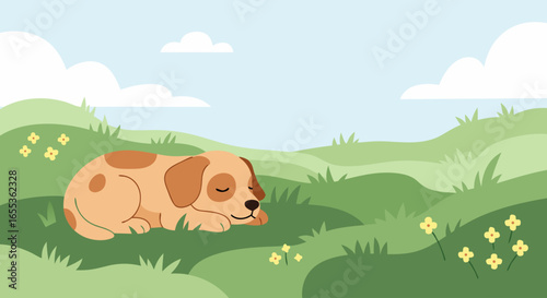 Peaceful Puppy's Nap in a Lush Meadow: A serene moment captured as a cute puppy peacefully sleeps on a green hill amidst lush fields and blue sky, embodying the simple joys of rest and relaxation.