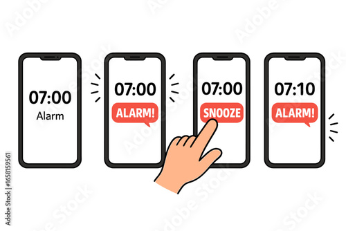 Smartphone alarm clock notification set. Hand pressing snooze button. Morning routine, wake up alert. Time management and procrastination concept. Vector illustration sequence.