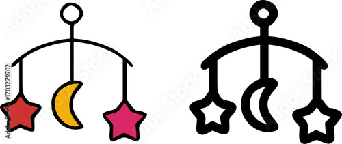 A colorful and a black and white outline illustration of a baby mobile with stars and a moon hanging from a curved bar.