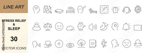 Stress Relief & Sleep Tech vector icon set with minimal line art designs of meditation, calm, wellness, sleep, tracker, and recovery. Perfect for apps, web, health, lifestyle, and UI projects.