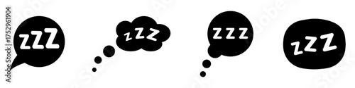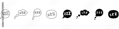 Zzz sleep snore icons set. Various designs of emojis and speech bubbles showing zzz text representing sleep