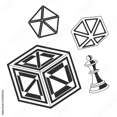 Abstract geometric shapes and a chess queen piece in a stylized black and white illustration with optical illusion elements