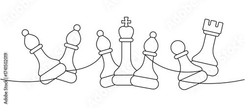 Set of five chess pieces in elegant minimalist abstract black and white linear composition