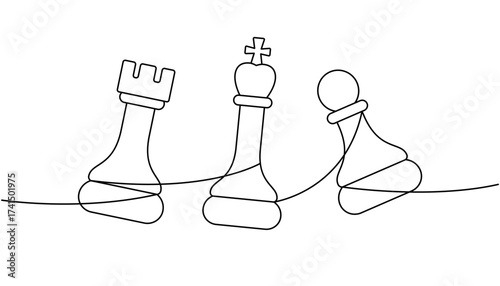 Rook, king and pawn chess pieces in minimalist abstract black and white linear style