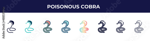 Six stylized cobra illustrations showcase variations in pose, color, and background, ideal for design projects needing a powerful, reptilian motif.
