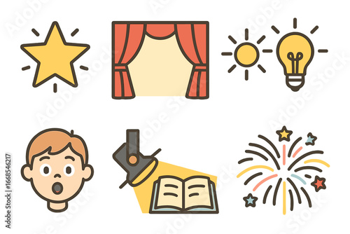 Revelation Symbols Icons. Flat vector icons of Revelation Symbols: rising sun, cracked mask, torn envelope, opened book, key