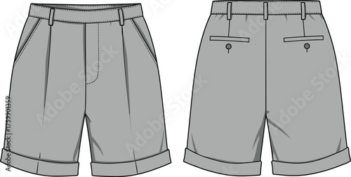 Technical fashion vector illustration of tailored shorts front and back view with waistband, belt loops, pockets, cuffed hem design