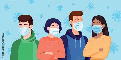 Group of people wearing medical masks to prevent illness, flu, covid in flat style. Vector illustration