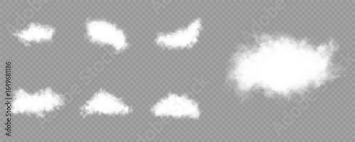 White vector realistic cloud set. Vector weather element on png background. Cloud texture, nature sky or foggy nature illustration isolated on transparent background.