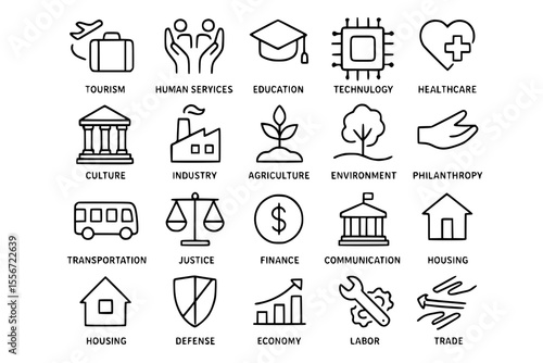 Sector of society icon set. Containing agriculture, education, healthcare, energy, technology, transportation, arts, justice and more. Outline Icon Collection. Vector illustration. Editable stroke