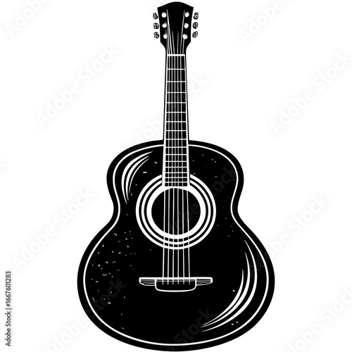 Illustration of a black and white acoustic guitar with visible strings and tuning pegs on the headstock