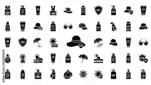 Flat heart shape set with sunscreen sticker, sunblock and spf lotion bottle and cream tube container sticker. Banner design concept shows cosmetic product collection sun care set for summer.